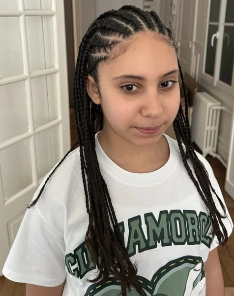 Cette coiffure correspond une coiffure protectrice Ă  la dame de la clientes. Ce sont des tresses collĂ©es classiques et des nattes simples derriĂšre. Il n’y a pas de mĂšches. La prestation a durĂ©e 2h30.
